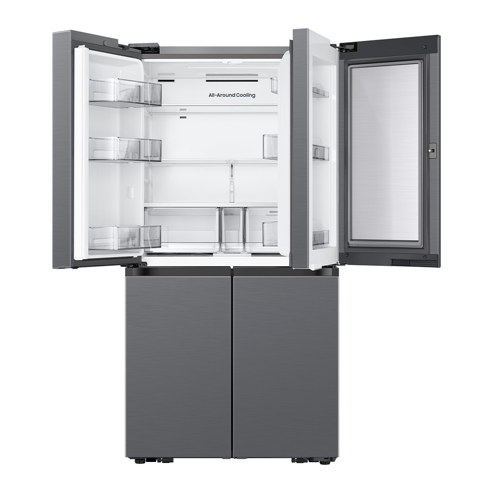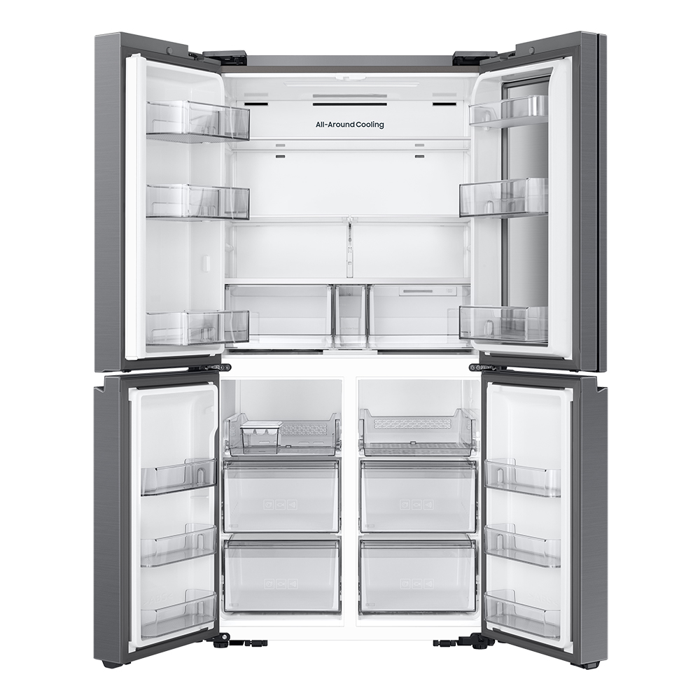 BESPOKE 4도어 냉장고 902L는 902L의 대용량으로 4인 가족 이상의 식료품을 충분히 수납할 수 있습니다. 냉장실과 냉동실이 각각 2개씩 분리되어 있어 식품 종류에 따라 최적의 온도로 보관할 수 있으며, 식재료를 더욱 신선하게 유지하는 데 도움을 줍니다. 또한, 다양한 크기의 선반과 서랍을 제공하여 식품을 효율적으로 정리하고 보관할 수 있습니다.