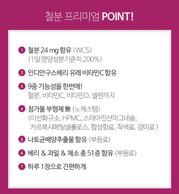 3. 복합 영양소 제공: 철분뿐만 아니라 비타민 C, 엽산, 비타민 B군 등 다양한 영양소를 함께 섭취할 수 있습니다.